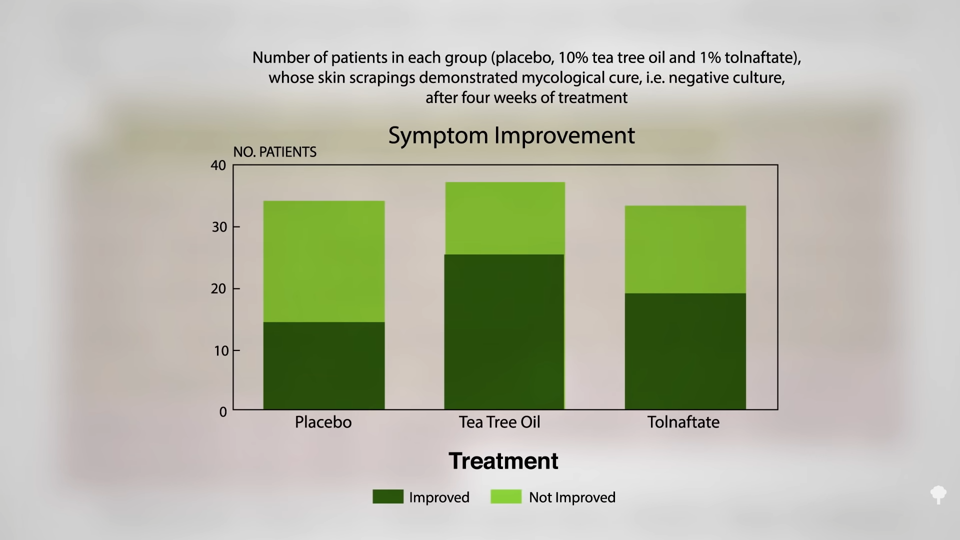 Might the same thing be happening in that athlete’s foot study I mentioned earlier? From a mycological cure standpoint—that is, a fungal cure standpoint—tea tree oil didn’t really do any better than placebo. And, although the drug treatment wiped out the fungus in 85 percent of cases, some of those patients didn’t actually notice an improvement in symptoms or even felt worse after using the drug, “probably a reflection of the minor irritant side effect” of Tinactin. If, instead of mycological cure, you looked at symptom improvement, tea tree oil works as well as the drug, as you can see below and at 4:14 in my video. “This may be the basis for the popular use of tea tree oil in the treatment of tinea pedis,” athlete’s foot. People should realize, though, that it’s just symptomatic relief, and they’re not necessarily eliminating the underlying cause. Of course, it “is possible that a higher concentration of tea tree oil would have better antifungal properties and even better efficacy in the treatment of tinea pedis.”