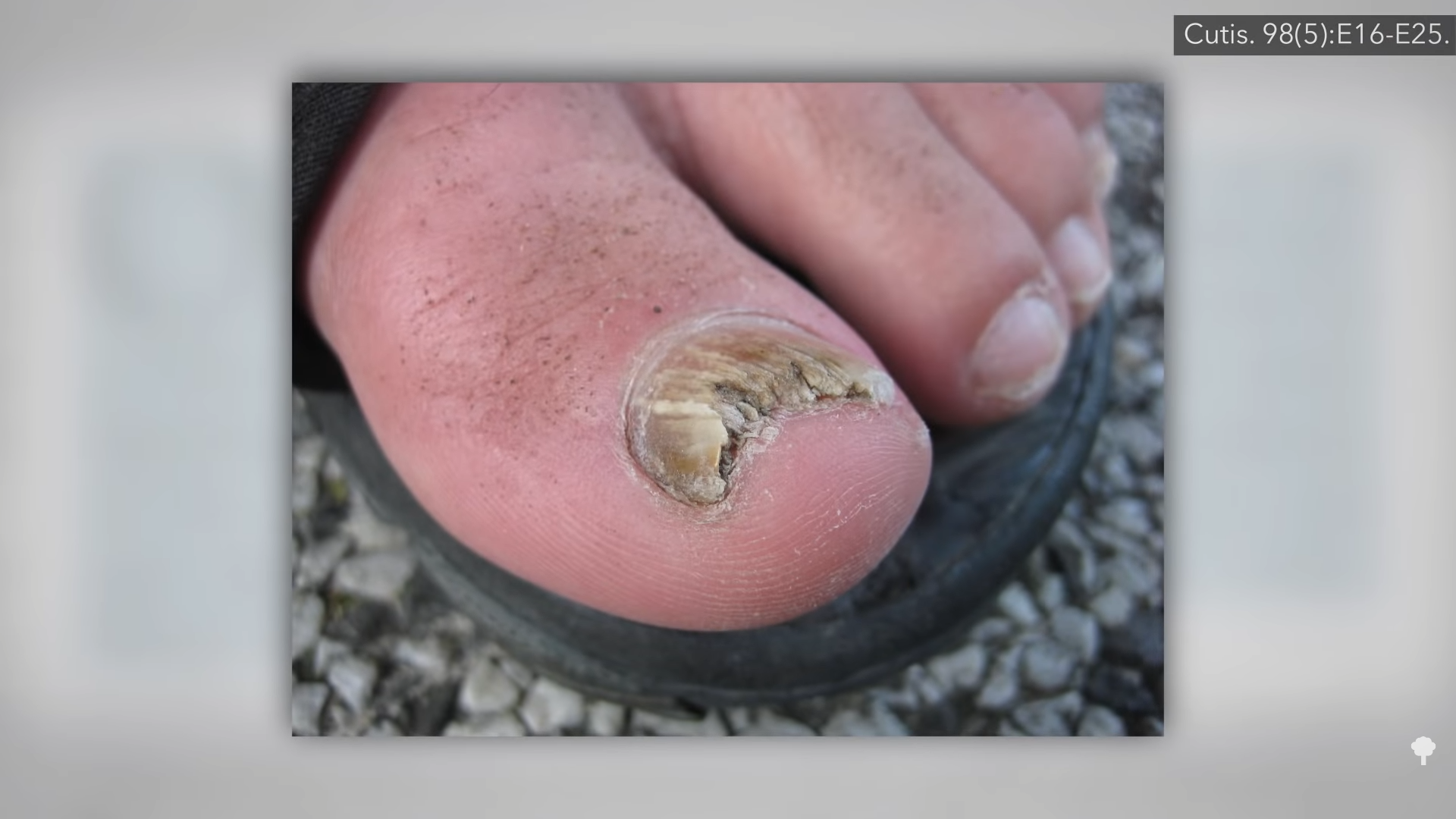 - Onychomycosis, a fungal infection of our nails, is characterized by discoloration, deformity, detaching, thickening, crumbling, and ridging, and may affect about 1 in 25 people, typically older adults.
