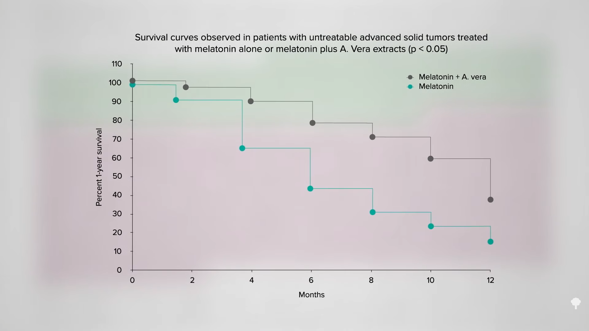 Fifty patients with advanced, untreatable cancer were treated either with daily melatonin, which researchers thought might boost anticancer immunity, or melatonin with about 20 drops of an aloe extract, prepared by soaking one part aloe leaves to nine parts 40-proof alcohol. And, the aloe group appeared to do better. They were nearly twice as likely to have either a partial response or at least some stabilization, and, the most important outcome, improved survival.