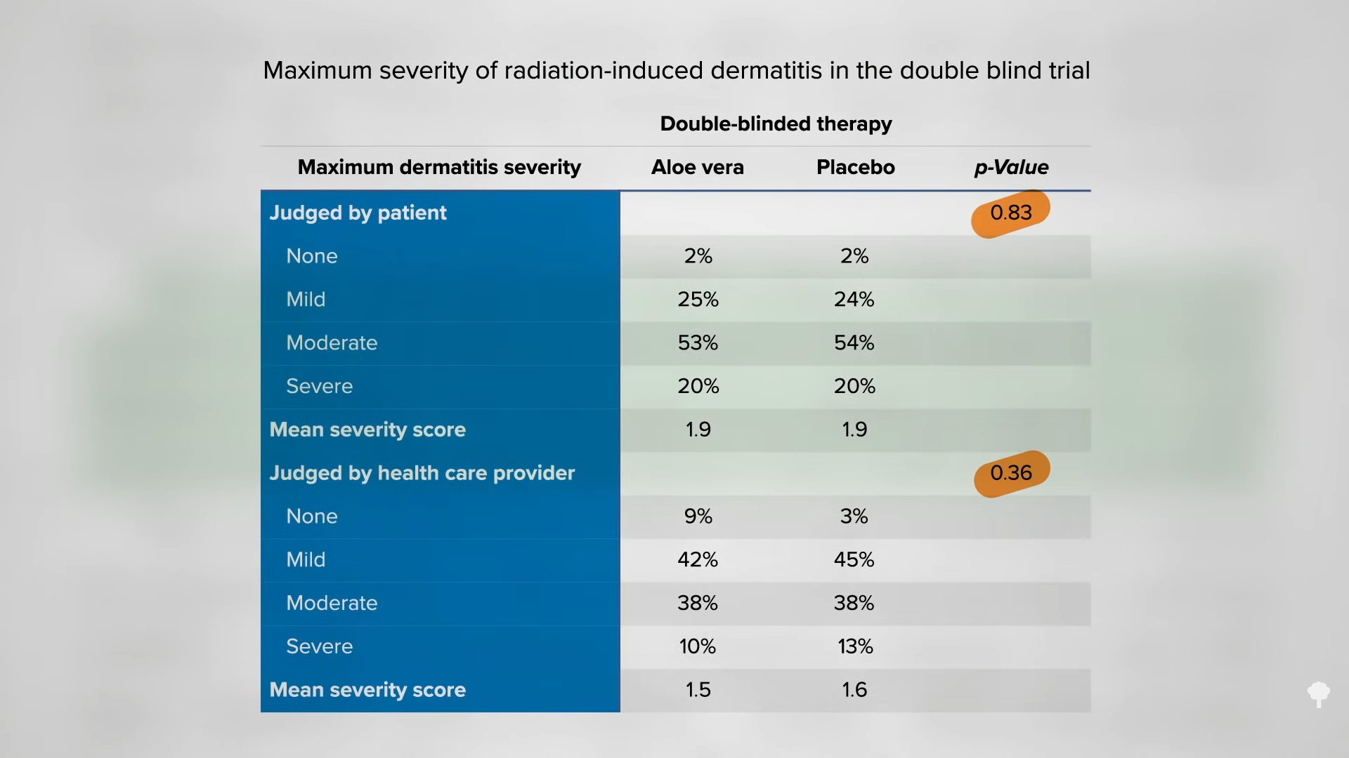 However, “after the completion of this double blind trial study, many involved clinicians felt that the patients participating in this trial had less dermatitis”—or skin inflammation—“than otherwise would have been expected. This raised the question of whether the placebo gel was causing some benefit (possibly due to skin lubrication).” So, to their credit, they ran a second experiment to see if aloe was better than nothing at all, and, once again, aloe appeared to have no effect at all. In both trials, the “severity scores were virtually identical,” meaning aloe vera gel simply didn’t work.