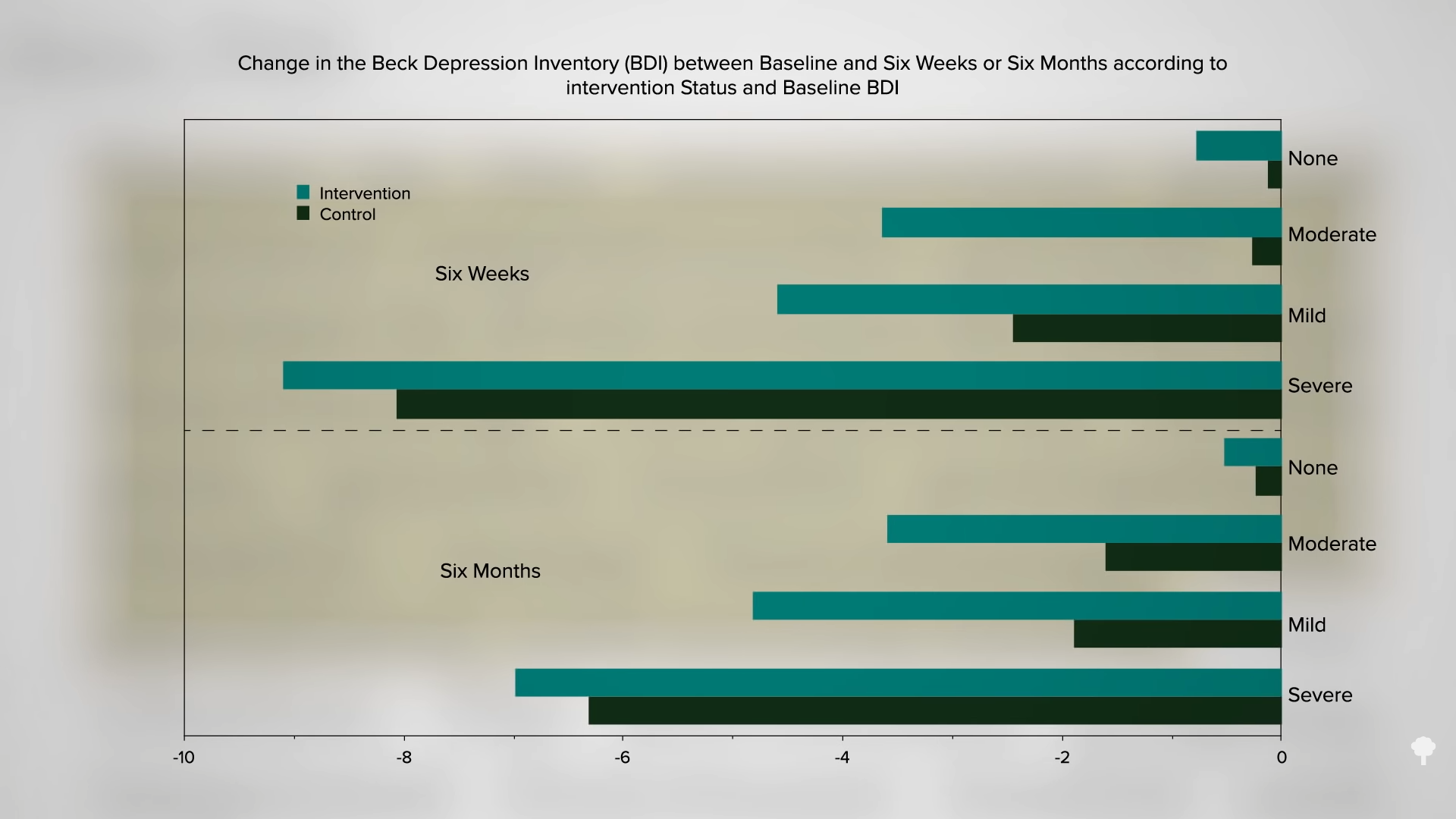 What about the mental health improvements? In a randomized controlled trial, those in the CHIP group showed significantly greater improvements not just in physical functioning, pain, and general health perceptions, but also vitality, social functioning, and emotional and mental health. For example, as you can see below and at 3:45 in my video, there were significant improvements, particularly in mild to moderate depression, compared with the control group—and not only right after the program ended, but six months later.