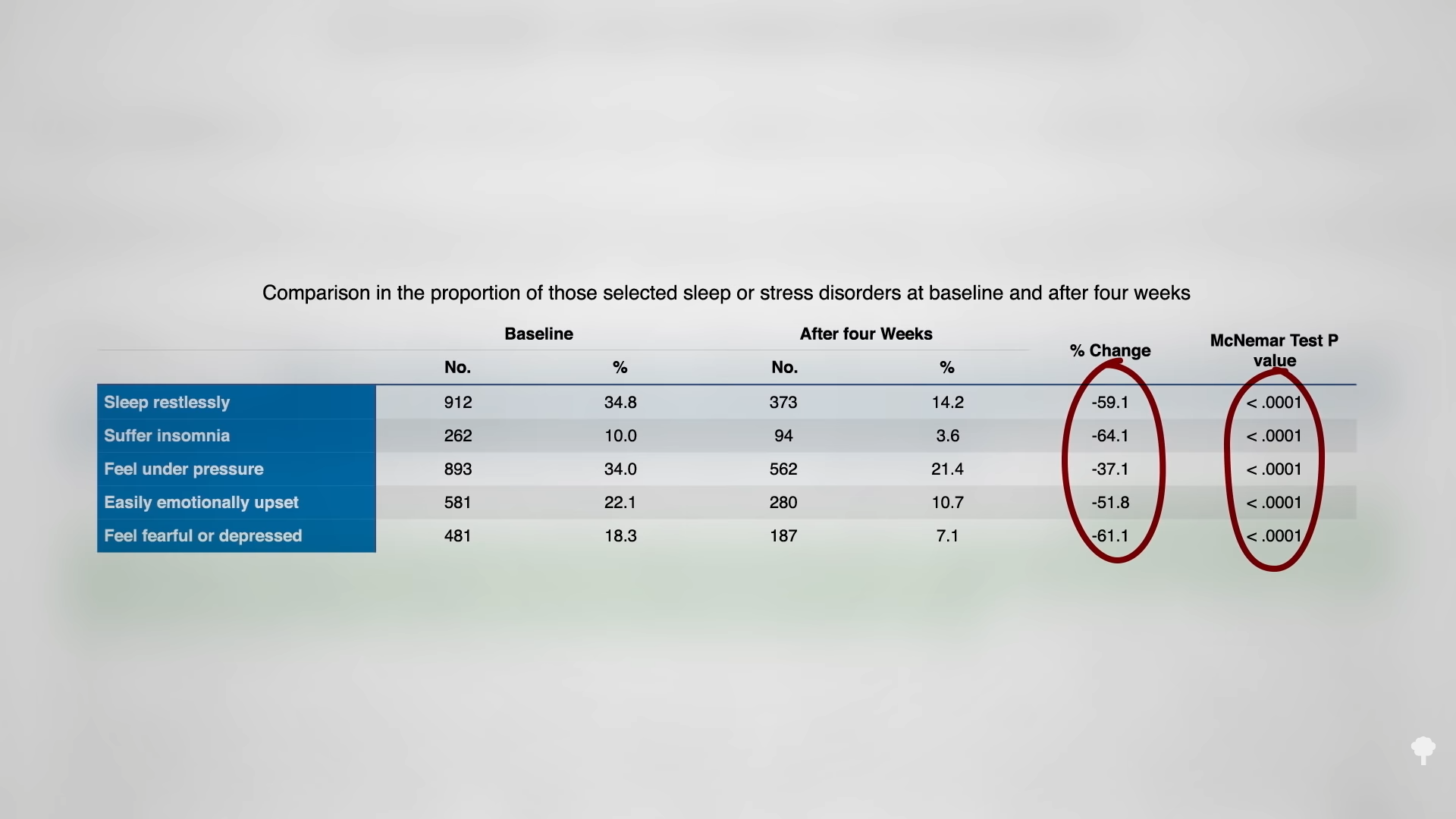 “Lifestyle change programs such as CHIP aimed at improving physical health behaviors can likewise have a profound effect on mental health.” Studies of thousands of individuals who went through CHIP (now called Pivio) have shown there were significant improvements in a number of “sleep or stress disorders,” such as sleeping restlessly, not sleeping at all, or feeling stress, upset, fear, or depression. Most of the numbers were cut in half, and all were highly significant findings, as you can see below and at 1:16 in my video. The question is, why?