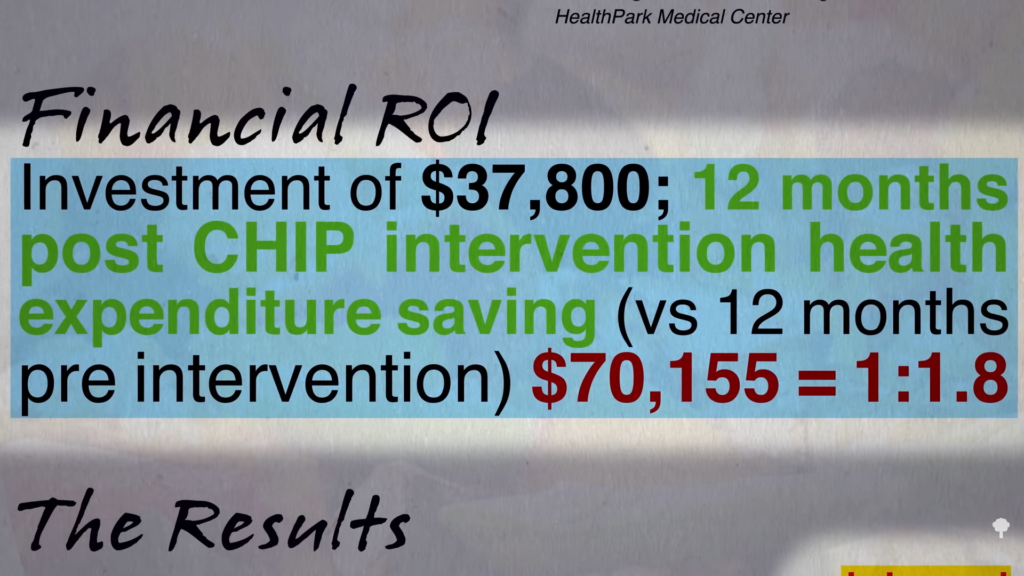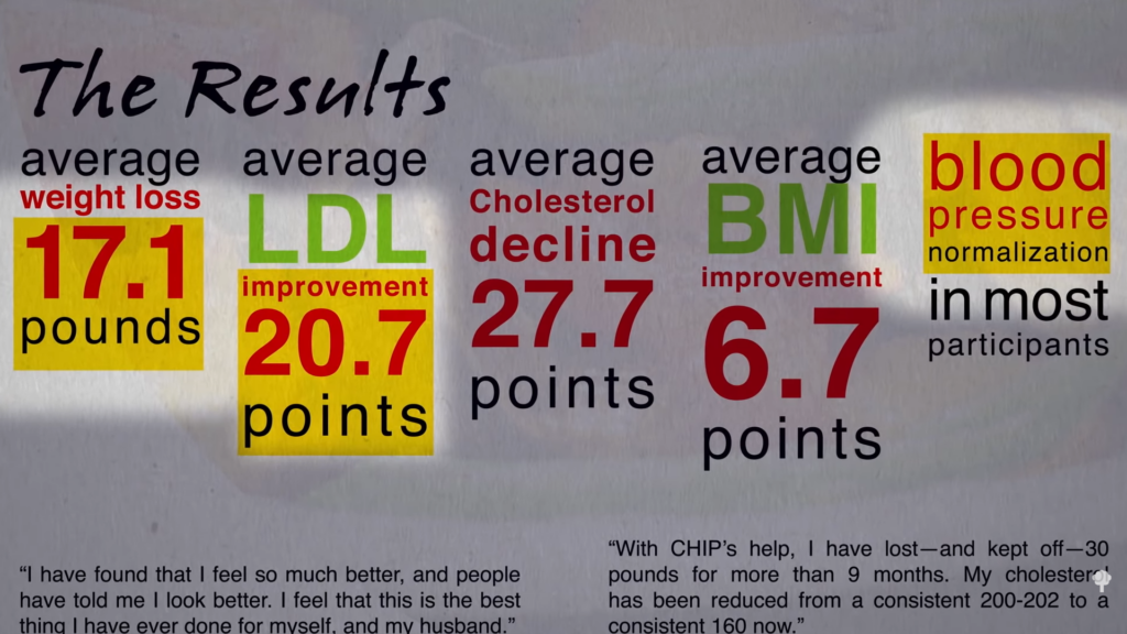 Lee Memorial, a health care network in Florida, offered CHIP to some of its employees as a pilot program. (Sadly, health care workers can be as unhealthy as everyone else.) As you can see below and at 3:05 in my video, they reported an average 17-pound weight loss, a 20-point drop in bad LDL cholesterol, and blood pressure normalization in most participants. Lee Memorial initially invested about $38,000 to make the program happen, but then saved $70,000 in reduced health care costs in just that next year. How? Because the employees became so much healthier. They got a financial return on investment of 1.8 times what they put in.