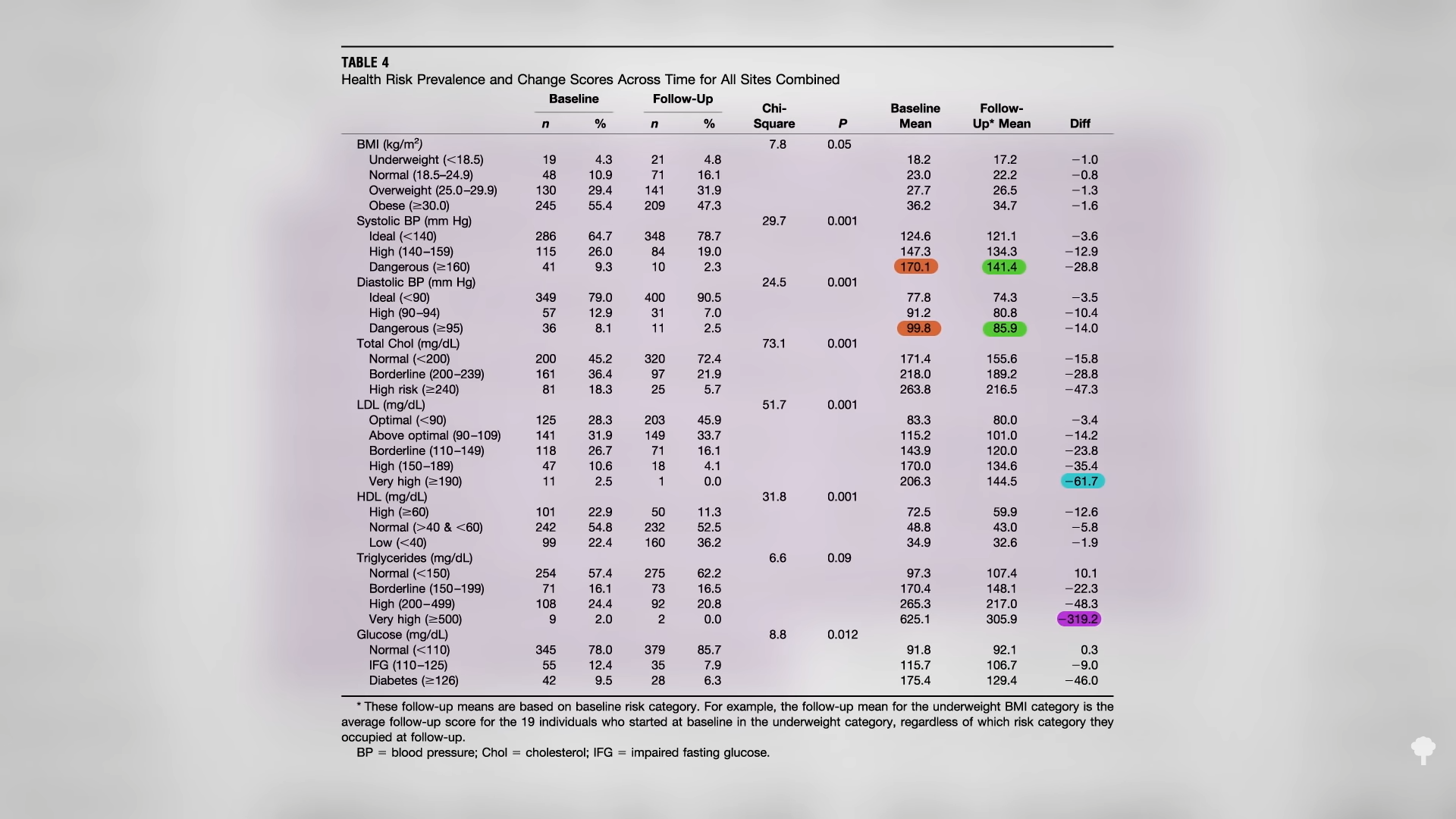 The largest workplace CHIP study done to date involved six employee populations, including, ironically, a drug company. The study included a mix of white-collar and blue-collar workers. As you can see below and at 4:40 in my video, there were dramatic changes experienced by the worst off. Those starting with blood pressures up around 170 over 100 saw their numbers fall to around 140 over 85. Those with the highest LDL cholesterol dropped 60 points and had a 300-point drop in triglycerides, as well as a 46-point drop in fasting blood sugars. Theoretically, someone coming into the program with both high blood pressure and high cholesterol might “experience a 64% to 96% reduction in overall risk of myocardial infarction,” a heart attack, our number one killer.