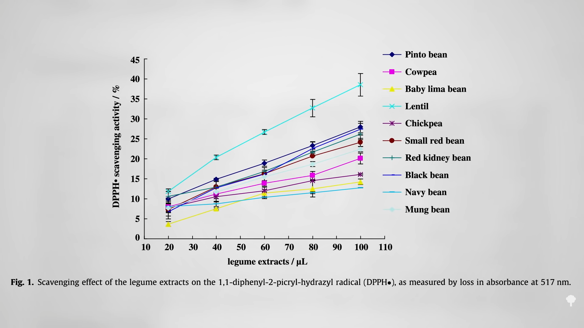 If you compared the total antioxidant content of ten different legumes, which do you think would come out on top? Researchers looked at the “pinto bean, baby lima bean, red kidney bean, black kidney bean [what I believe we more commonly know as black bean], navy bean, small red bean, black eyed bean [black-eyed pea], mung bean, lentil, and chickpea.” Who can guess the winner and the loser? As you can see at 0:33 in my video Benefits of Lentils and Chickpeas, lima beans came in at number ten at the bottom of the list. Then came navy beans, black-eyed peas, and mung beans, which is what bean sprouts are typically made from, in seventh place. Moving into the winner’s circle, kidney beans. I’ll bet many would have guessed those to be our number one, but, no. They came in sixth, in the middle of the pack. Five legumes beat them out: pinto beans, black beans, the bronze to small red beans, the silver to chickpeas (garbanzo beans), and the gold to lentils. As you can see below and at 1:17 in my video how lentils pull away from the pack in terms of scavenging up free radicals. Lentils top the charts based on a variety of different measures. Might it be because they’re so small and their nutrients are concentrated in the seed coat, so smaller means more surface area? That would be my guess.