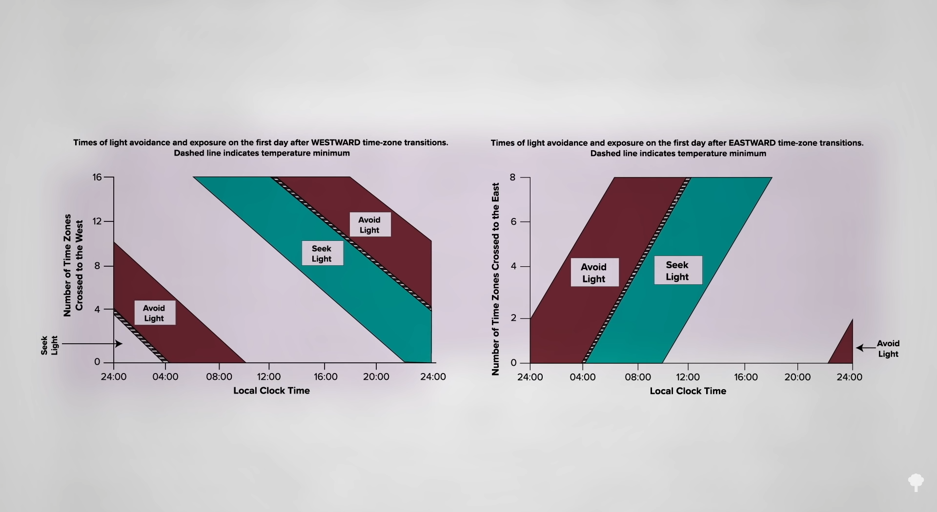 What about if you’re flying eastward more than eight time zones? In that case, you subtract the number from 24 and treat it as travel westward. For instance, an eastward trip across ten time zones—New York to Delhi, say—should be treated as a westward flight, requiring a delay of the body clock across 14 time zones. In that case, it would be easy to get outside and get some sun, but what would you do if you just went four zones westward and needed to get light in the middle of the night?