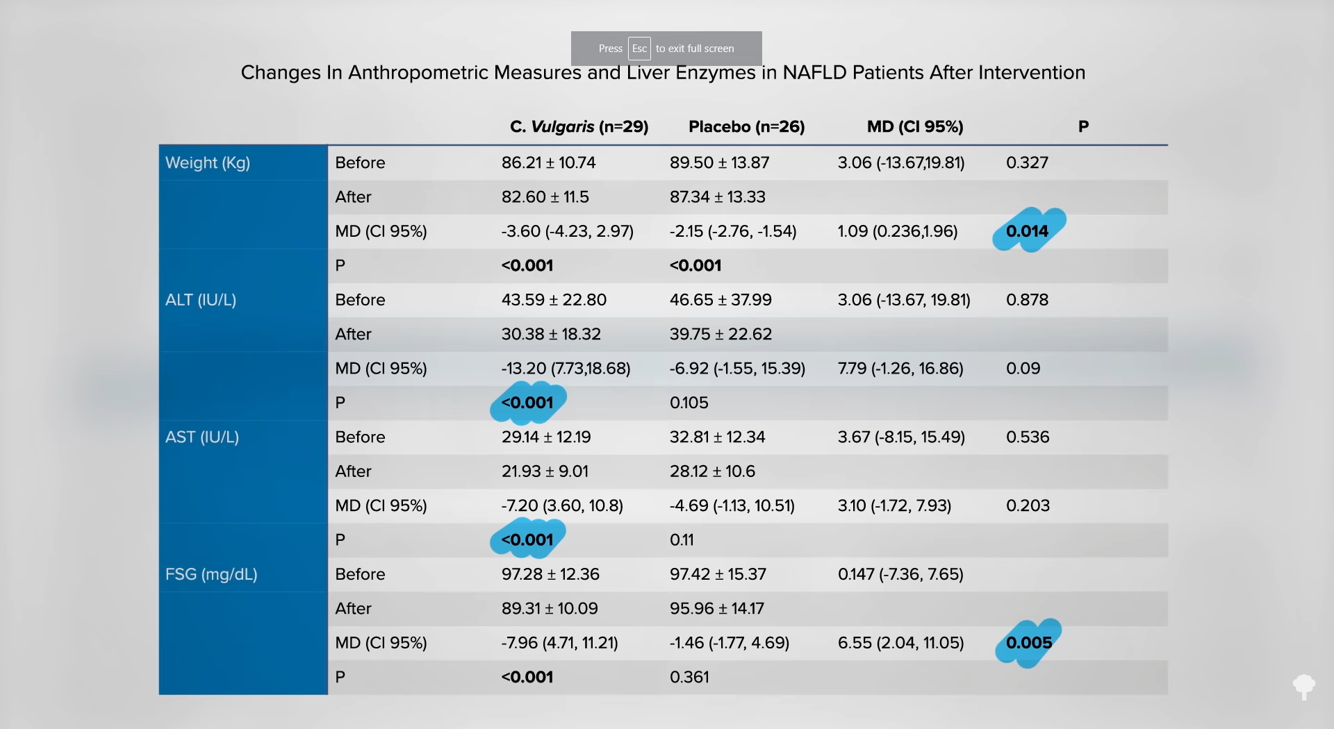 What we need is a randomized, double-blind, placebo-controlled trial of Chlorella for liver disease…and we finally got just that. And, not just any liver disease, but non-alcoholic fatty liver disease, which, thanks to the obesity pandemic, now affects one in four people on Earth. Let’s see if 1,200 mg of Chlorella  will help. (That’s just about a daily half-teaspoon, costing about nickel a day.) As you can see below and at 2:21 in my video, the researchers saw significant drops in liver inflammation, perhaps because the subjects lost significantly more weight—about a pound a week over the eight weeks—and that would explain the significant improvement in fasting blood sugars that was also found. The researchers conclude that Chlorella has “significant weight-reducing effects” with “meaningful improvements” in liver function.