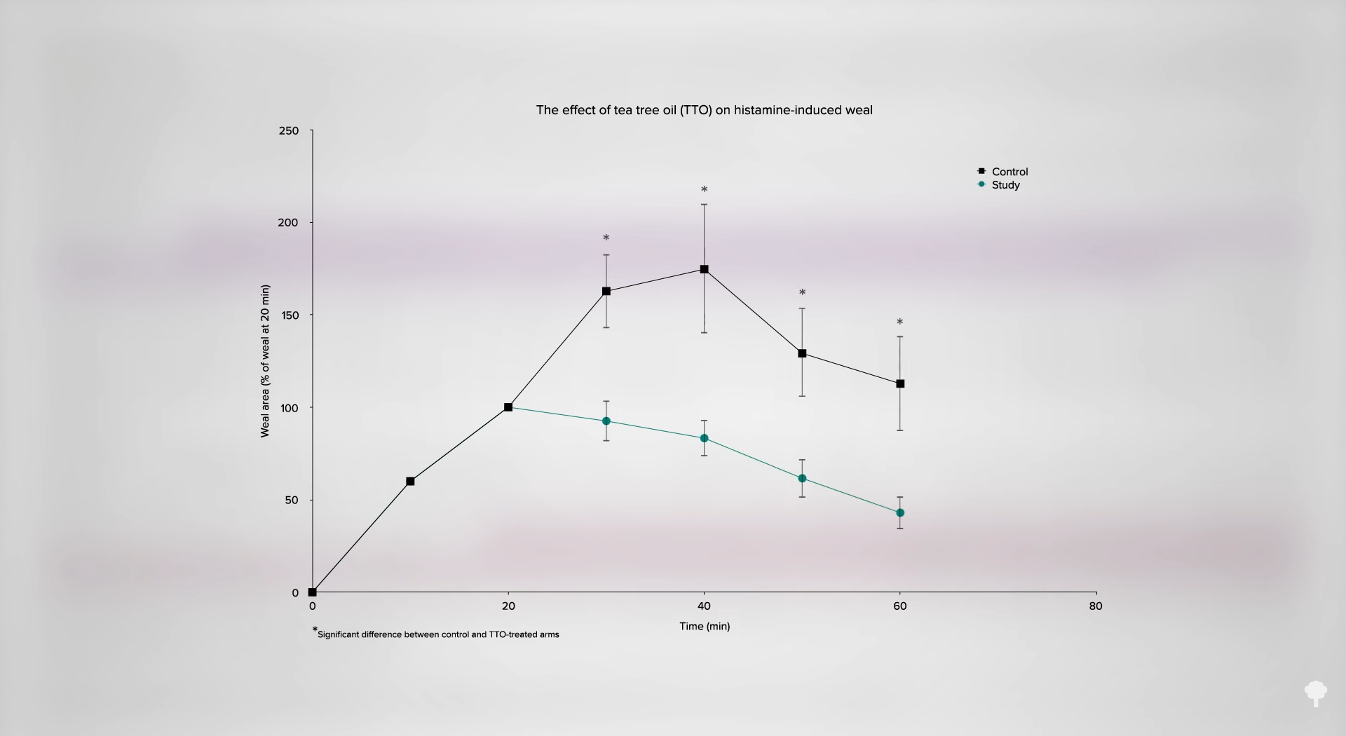 Normally, tea tree oil reduces skin inflammation. Researchers injected histamine into the skin of 27 volunteers, the equivalent of getting bitten by a fire ant. The application of tea tree oil significantly decreased the associated swelling and discoloration—the big, red, swollen mark. As you can see in the graph below and at 0:45 in my video, the swelling and discoloration continues to get worse after application of a placebo oil, before finally beginning to calm down at around 40 minutes. If you apply half of a single drop of pure tea tree oil at 20 minutes, though, it stops the inflammation in its tracks and it immediately starts to get better.