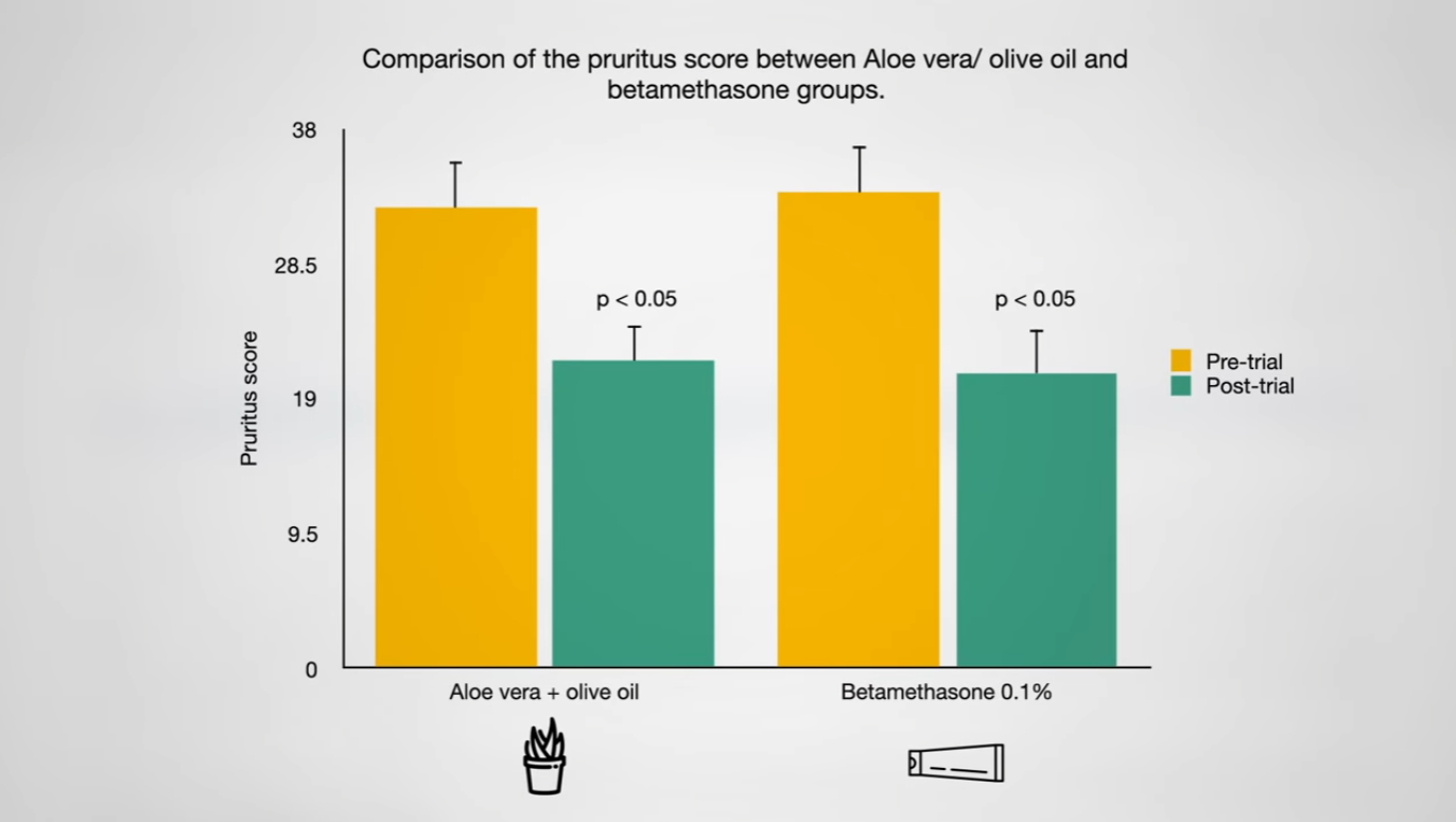 Sixty-seven veterans injured by chemical warfare were randomized to apply either steroids or an aloe vera and olive oil cream, and the aloe vera mixture appeared to work as well as the drug, as you can see in the graph below and at 2:27 in my video.
