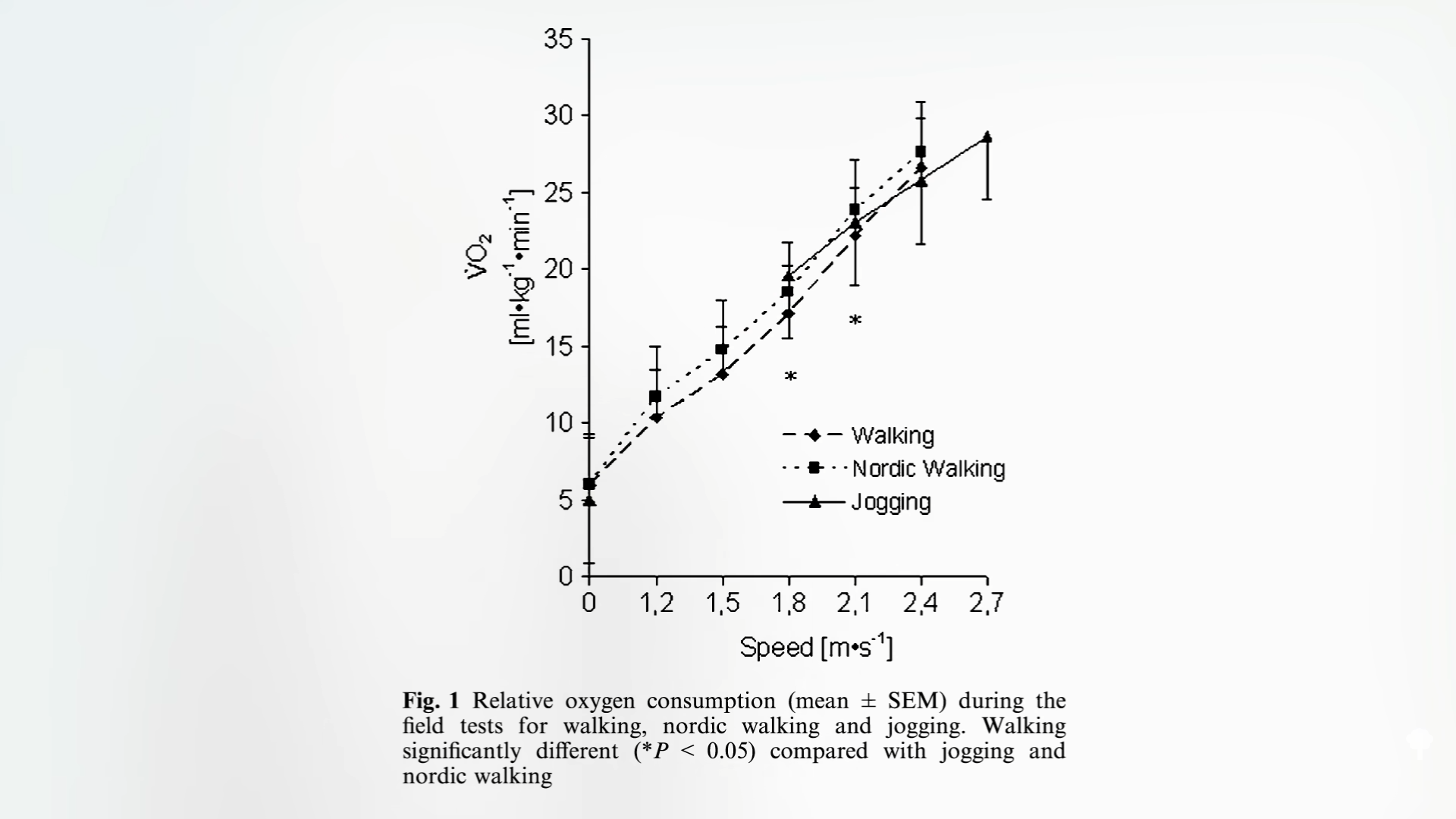 Perhaps this should not be surprising, given the greater exercise intensity of pole walking, even approaching that of jogging at higher speeds, shown below and at 5:15 in my video. And that’s where I see the role of walking poles—to fill the intensity gap between people who are ready to graduate from walking but aren’t ready for more rigorous activities, such as running. The only potential downsides are the added expense and, “reminded of Monty Python’s famous ‘ministry of silly walks’ sketch…‘feeling fairly ridiculous’ when trying Nordic walking for the first time.”