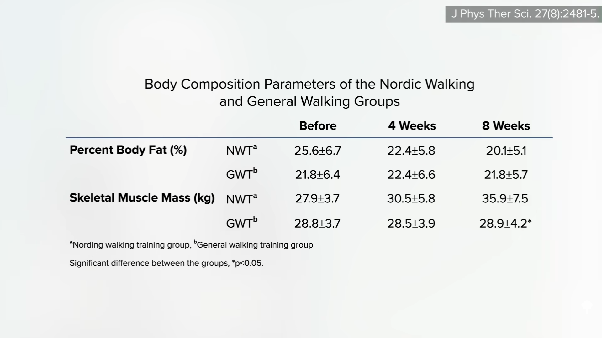 Before and after studies demonstrate weight loss with pole walking, compared to a sedentary control, but what about compared to regular walking? Of the four such studies I could locate, comparing thrice weekly 40- to 60-minute sessions of Nordic pole walking to regular walking, every single one found no significant difference in body fat measures after 8 weeks, 12 weeks, another at 12 weeks, or 13 weeks. You can see the last one below and at 4:16 in my video.