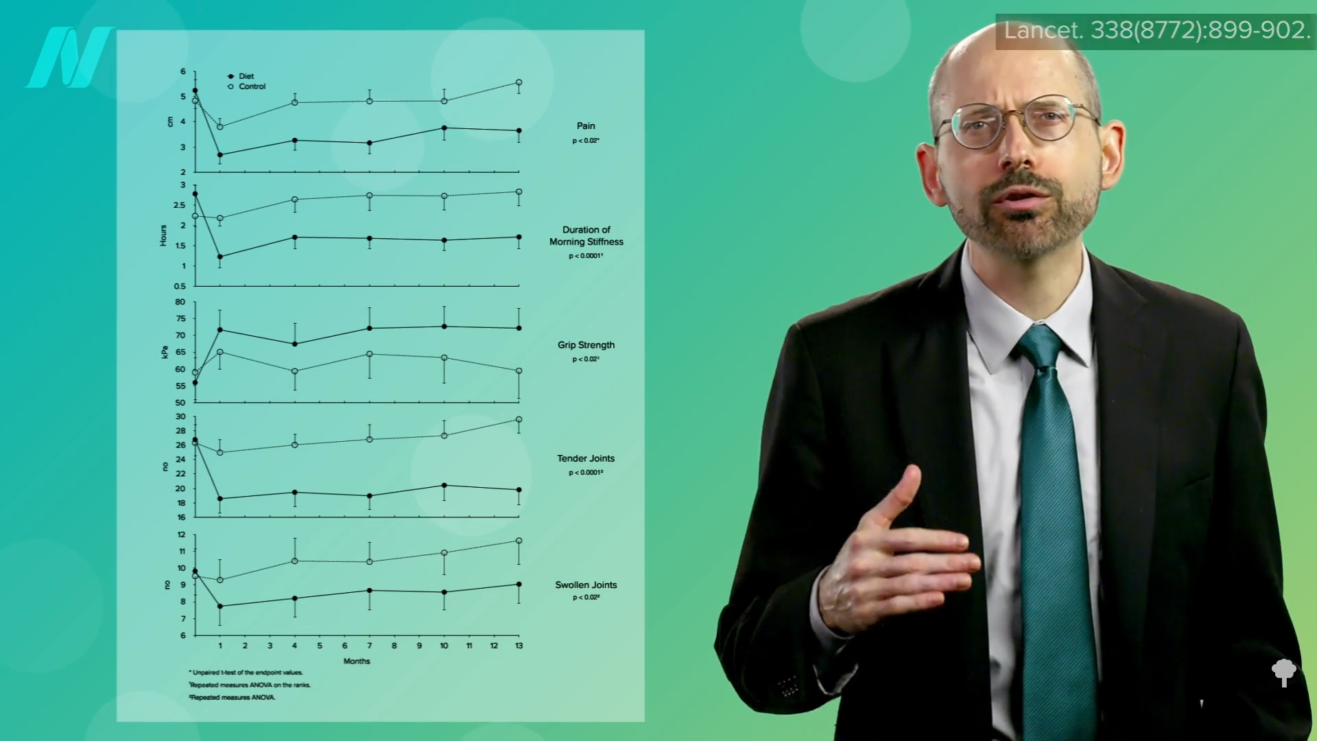 Ten different measures of inflammation decreased significantly after the fasting and subsequent meat- and egg-free diet, whereas none of the parameters budged in those individuals with rheumatoid arthritis who continued to eat their regular diets. What’s more, this squelching of inflammation translated into a significant reduction in pain, morning stiffness, loss of grip strength, and the number of tender and swollen joints, as you can see below and at 3:43 in my video.
