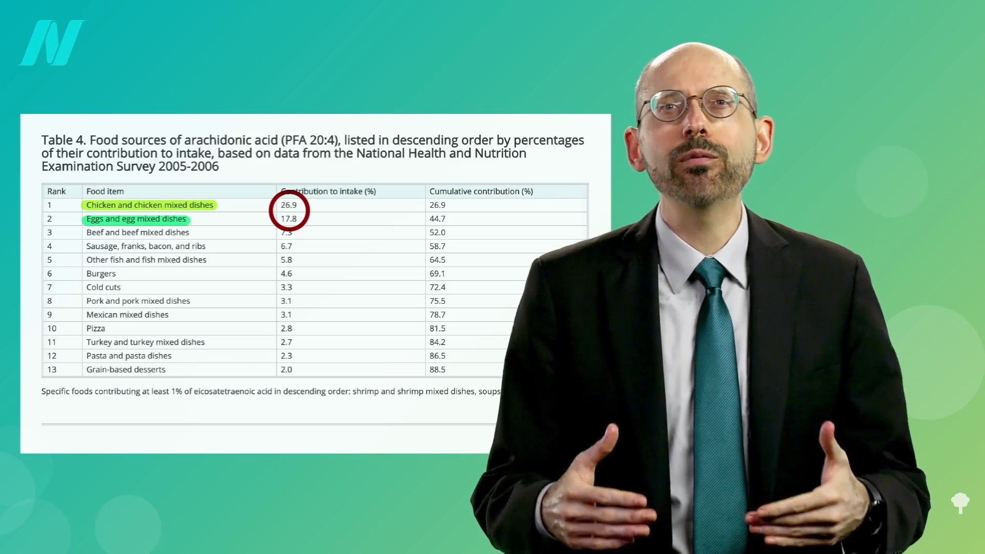 It could be as simple as eicosanoids, the mediators of inflammation that are formed from arachidonic acid. Arachidonic acid is a long-chain, inflammatory, omega-6 fatty acid found in animal fats. As seen below and at 5:04 in my video, the biggest contributors are chicken and eggs, which together contribute nearly half the intake of Americans. That’s also been suggested as an explanation for why those eating more plant-based appear to have better mental health; they aren’t suffering the “cascade of neuroinflammation” caused by arachidonic acid. It’s also why removing eggs, chicken, and other meats was shown to improve mood in a randomized controlled trial, suggesting the arachidonic acid “may negatively impact mood state.” It may also help explain the impact of more plant-based diets on inflammatory diseases like rheumatoid arthritis.