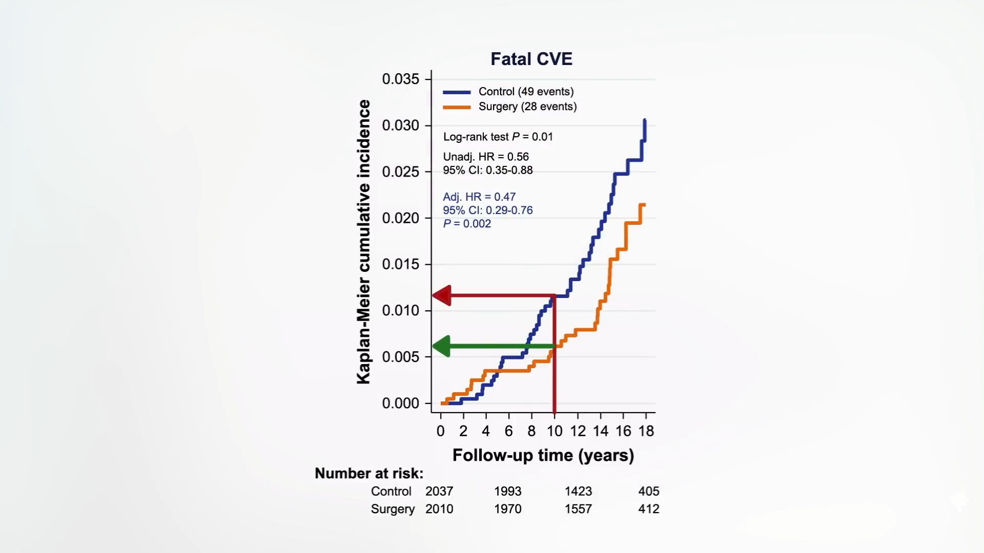 Enter the Swedish Obese Subjects (SOS) trial, the first long-term controlled trial to compare the outcomes of thousands of bariatric surgery patients to matched control subjects who started out at the same weight but went the nonsurgical route. Individuals in the control group maintained their weight, whereas those in the surgical group maintained about a 20 percent weight loss over the next 10 to 20 years. In that period, those in the weight-loss group not only developed 80 percent less diabetes, but they suffered significantly fewer heart attacks and strokes. So, unsurprisingly, they significantly reduced their total mortality overall. Ten years out, the weight-loss group appeared to cut their risk of fatal heart attacks and strokes in half, as shown below and at 4:23 in my video.