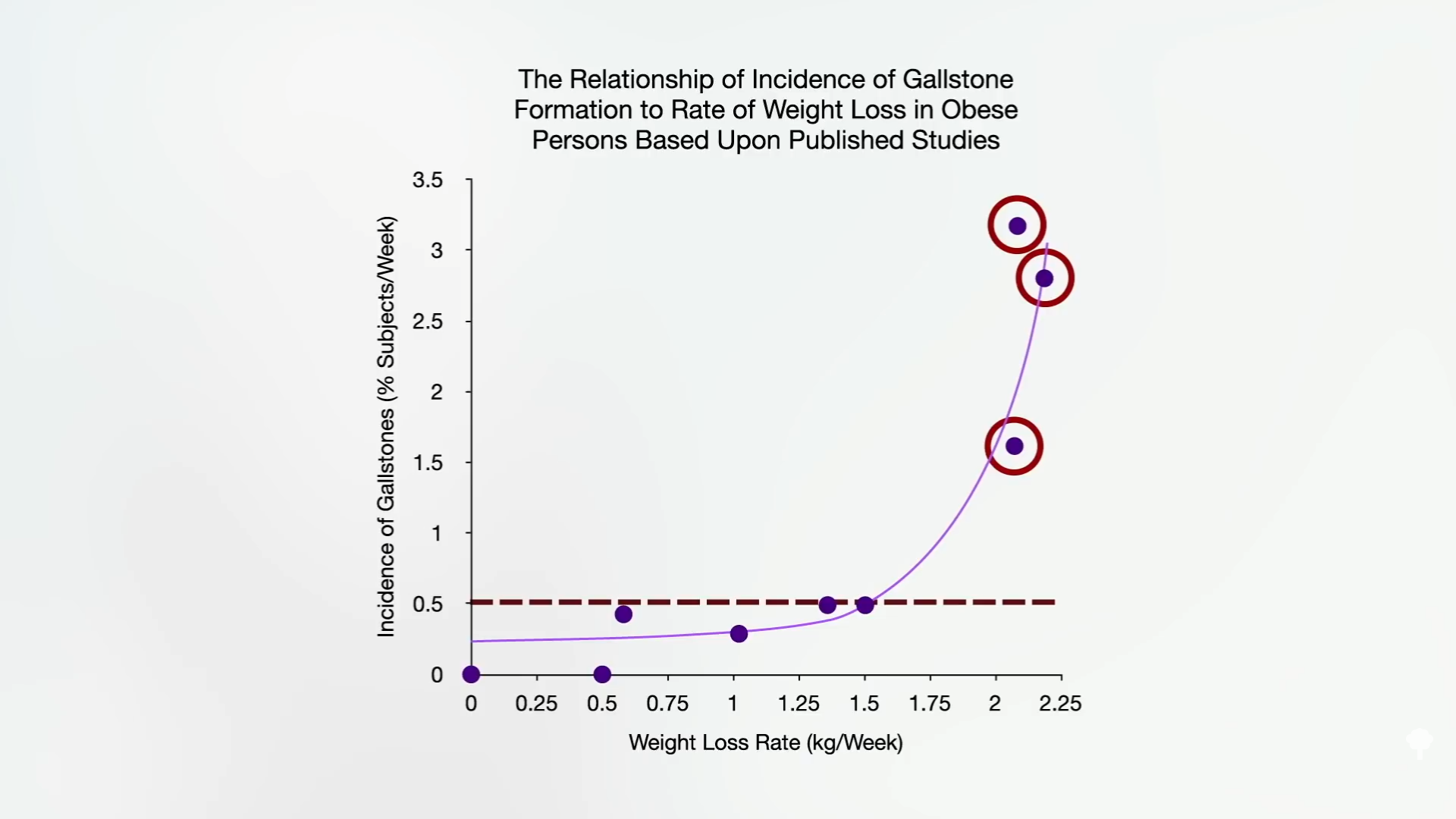Ironically, rapid weight loss may also be a trigger. Half a pound (1.5 kg) a day has been deemed the upper limit for medically safe weight loss, based on gallstone formation. Ultrasound studies found that, above that, the chance of new gallstones can go from less than 1 in 200 a week to closer to 1 in 40, as shown below and at 1:59.