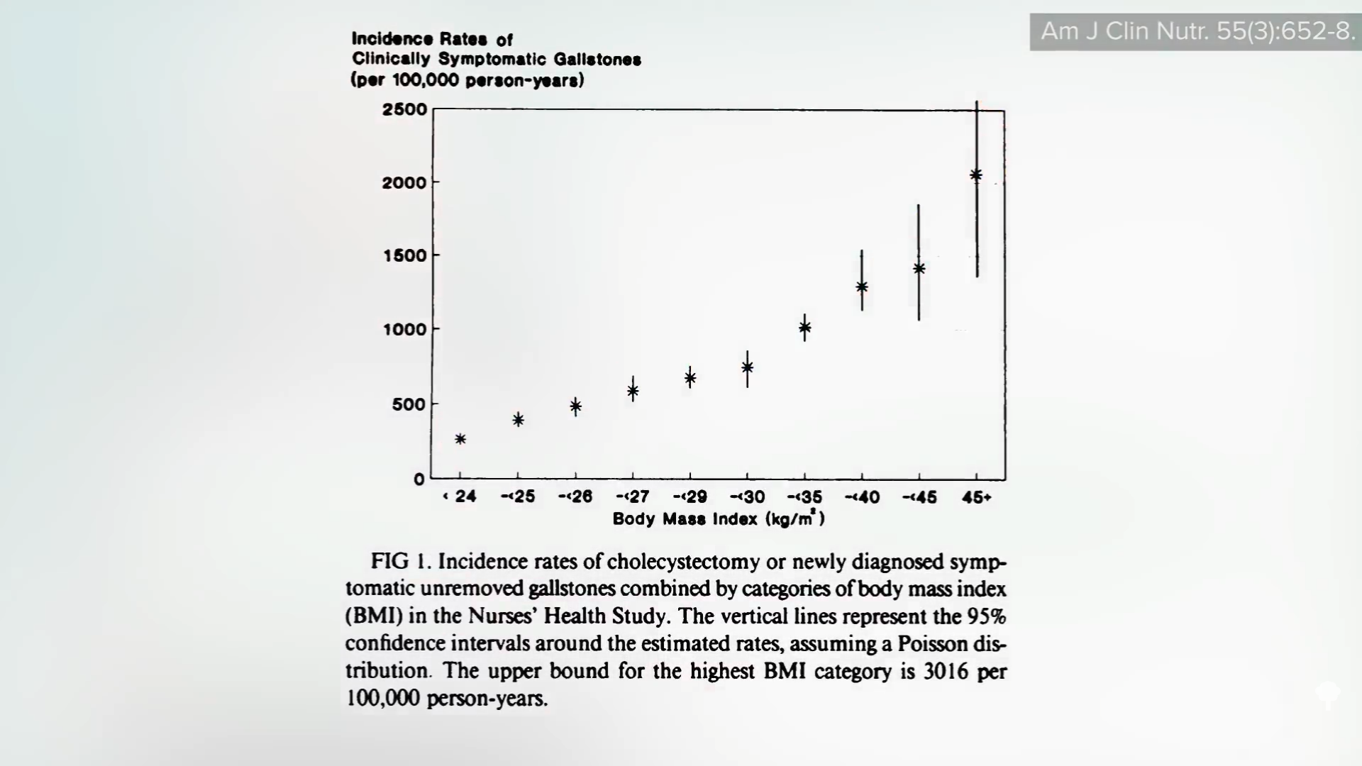 As I discuss in my video The Effects of Obesity on Gallstones, Acid Reflux, and Cardiovascular Disease, the biggest purported cause-and-effect risk factor may be obesity, increasing risk as much as sevenfold, as you can see below and at 1:32 in my video, with a doubling of risk even at the heavier side of “the normal BMI range.”
