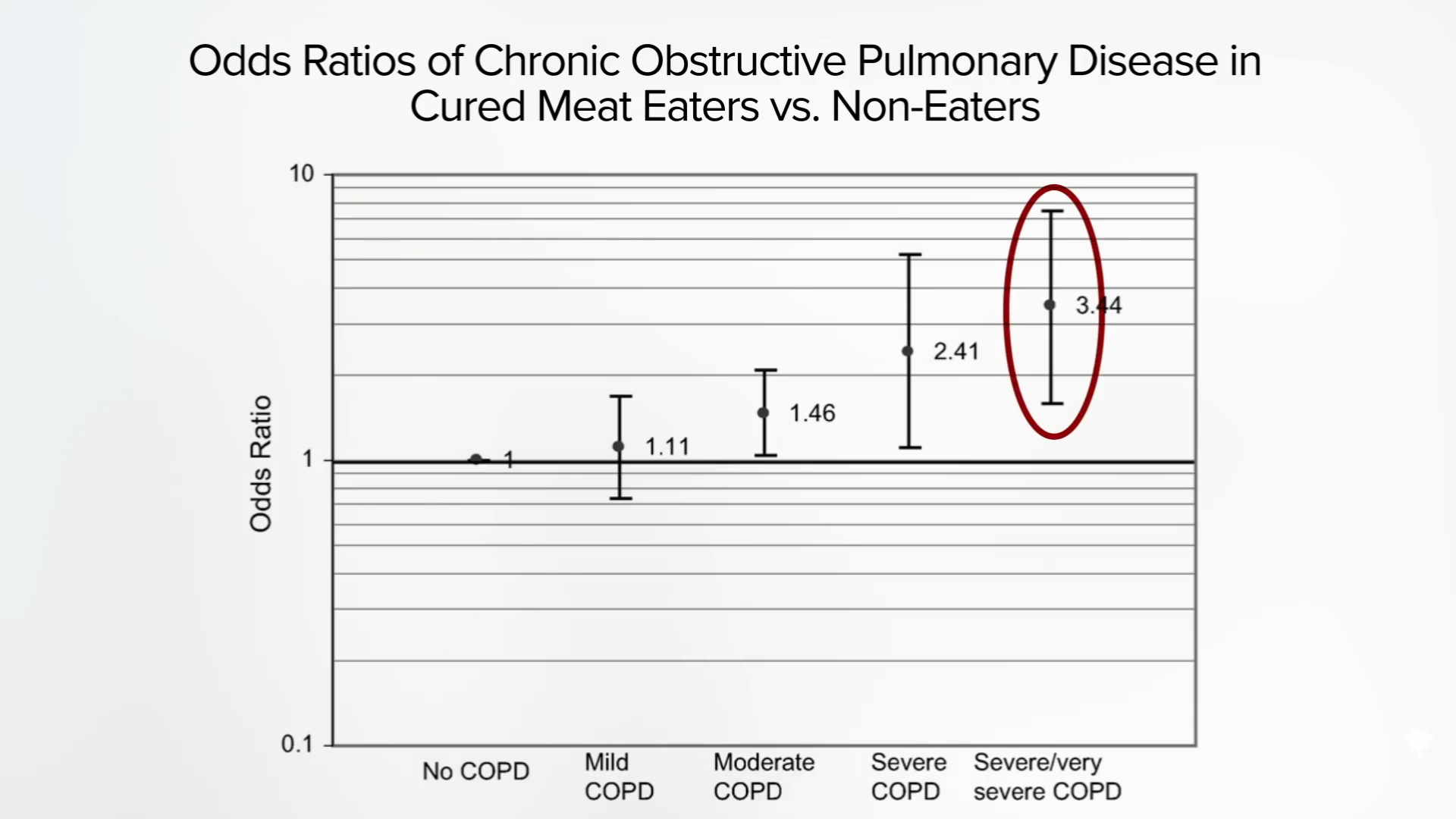 As I discuss in my video Does Processed Meat Affect Our Lung Function?, nitrites are added to processed meats as preservatives to preserve their pink hue (so the meat products don’t turn gray), keep them less rancid-tasting, and prevent the growth of diseases like botulism. But, if that same sodium nitrite is put into the drinking water of lab animals, they develop emphysema. Nearly all of them develop emphysema. That was the extent of the scientific knowledge we had on the subject going into 2007, then this study was published: “Cured Meat Consumption, Lung Function, and Chronic Obstructive Pulmonary Disease Among United States Adults.” It found that frequent consumption of cured meat is associated with an increased risk of people developing diseases like emphysema, a form of chronic obstructive pulmonary disease (COPD). As you can see below and at 1:32 in my video, eating it every other day appeared to triple the odds of severe COPD.