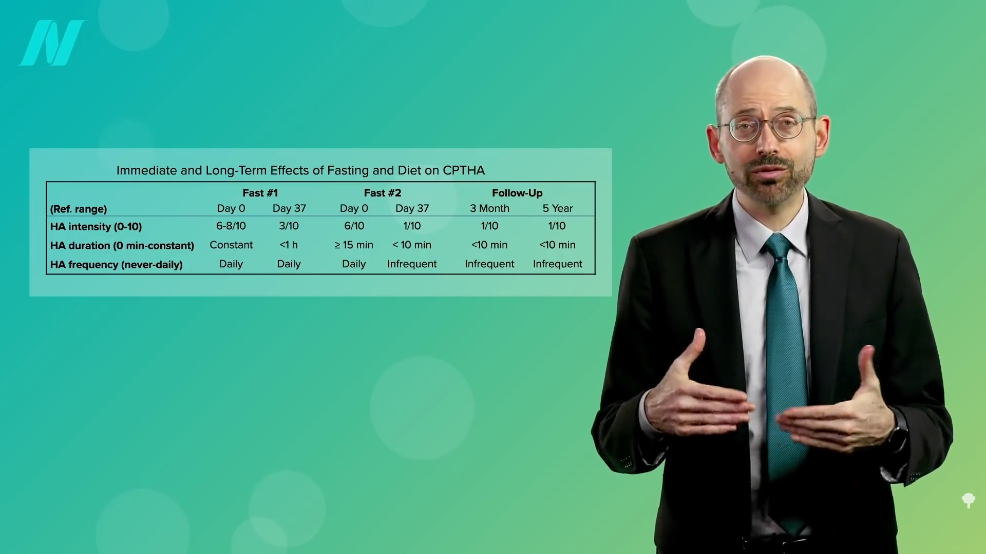 Before then, she had tried drug after drug after drug after drug after drug—with no relief, suffering in constant pain for years. Before the fast, she started out in constant pain. Then, after the fast, the intensity of the pain was cut in half, and though she was still having daily headaches, at least there were some pain-free periods. Six months later, she tried again, and eventually her headaches became mild, lasting less than ten minutes, and infrequent. She continued that way for months and even years, as you can see below and at 1:45 in my video Fasting for Post-Traumatic Brain Injury Headache.