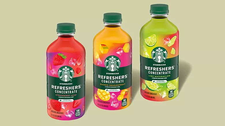 Starbucks Refreshers Concentrates will be available in Strawberry Acai and Mango Dragonfruit, inspired by the café, along with an exclusive at-home flavor, Lime Watermelon.