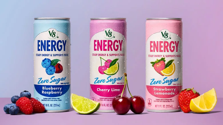 V8 Energy Zero Sugar is available in three flavors: Blueberry Raspberry, Strawberry Lemonade and Cherry Lime. The fruit-forward flavor profiles align with consumer familiarity while allowing for sugar-free formulation in a category traditionally associated with sweetness and high caffeine content.