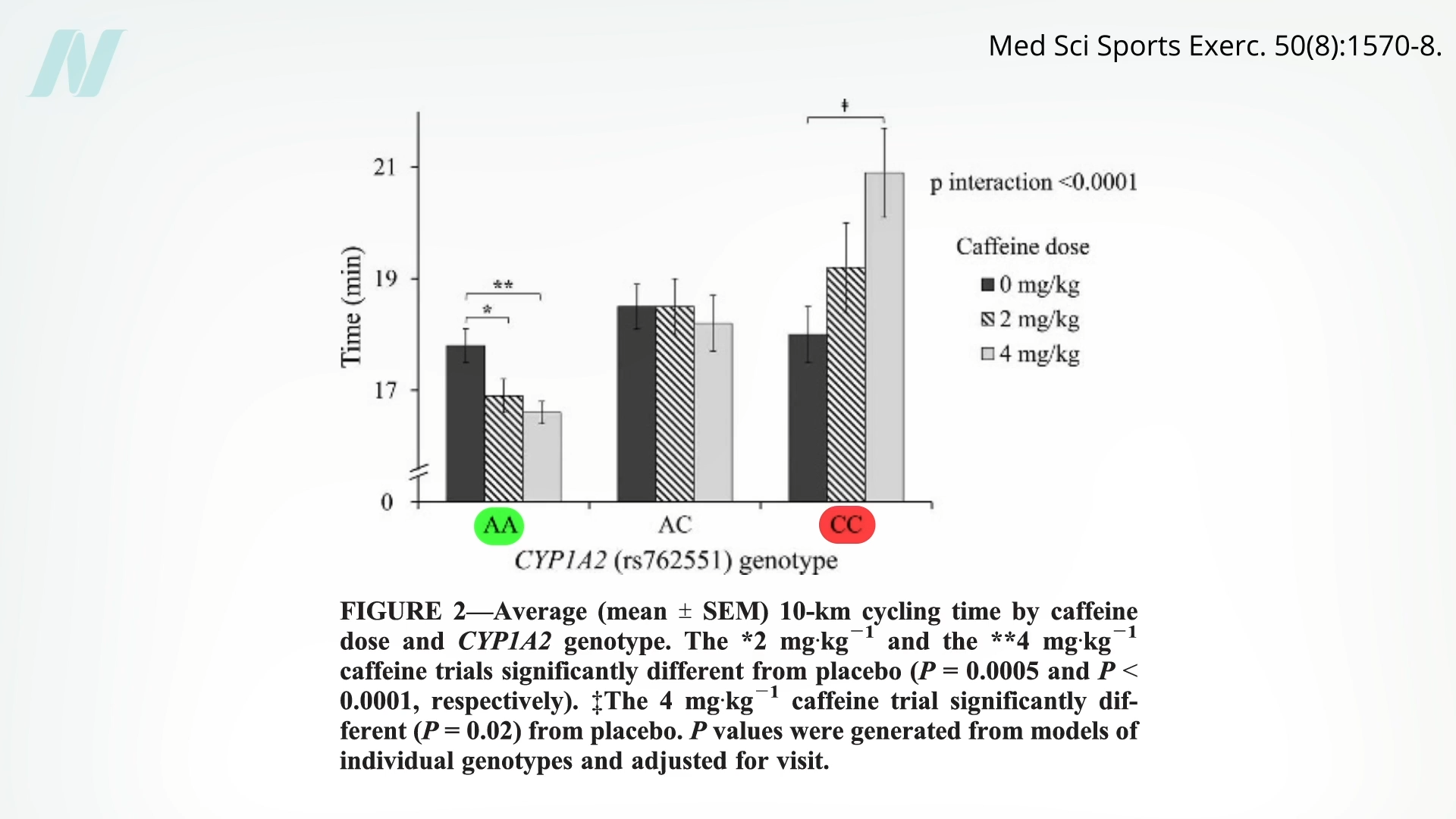 Now, there certainly are some legitimate differences between people. Some have a peanut allergy and keel over if they eat a peanut, others have celiac disease and need to avoid gluten, and some are genetically lactose-intolerant. There’s an enzyme mutation common in some parts of Asia that protects against alcoholism because people with the altered enzyme don’t metabolize alcohol as efficiently, so toxic metabolites build up. I published a fascinating video about fast versus slow caffeine metabolizers and the difference in health benefits that actually extends to athletic performance. Caffeine is ergogenic—performance-enhancing—but only in fast metabolizers, shaving more than a minute off 10 kilometers (about 6 miles) of cycling, whereas slower metabolizers either got no benefit or the caffeine actually slowed them down, adding two minutes to their cycling time, depending on which kinds of genes they have that code the enzyme that breaks it down. You can see these results below and at 1:24 in my video How Useful Is Personalized Nutrition?.