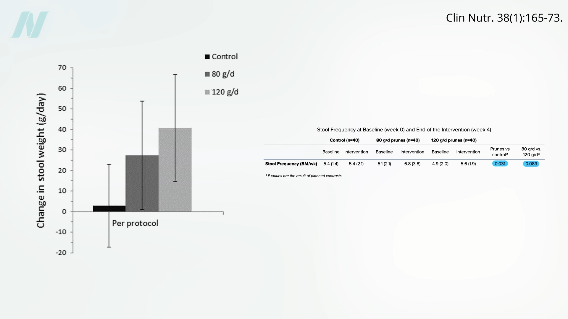That’s why we need studies like this: Participants were randomized to about 8 prunes a day plus a large glass of water, 12 prunes and water, or just the water alone. So, even the control group got an intervention (the water), which might help with constipation. Previous studies mostly assigned about 10 prunes a day, so the researchers wanted to see if more prunes provided greater benefit or whether fewer would work just as well. They found a significant improvement in stool bulk on the prunes and a significant increase in bowel movement frequency, as you can see below and at 2:45 in my video Prunes: A Natural Remedy for Constipation, though there was no real difference between 8 and 12 prunes. So, 8 a day seems sufficient.